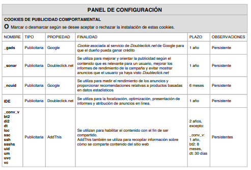 • Cookies publicitarias: Muestran publicidad en función de su navegación, su país de procedencia, idioma, etc.